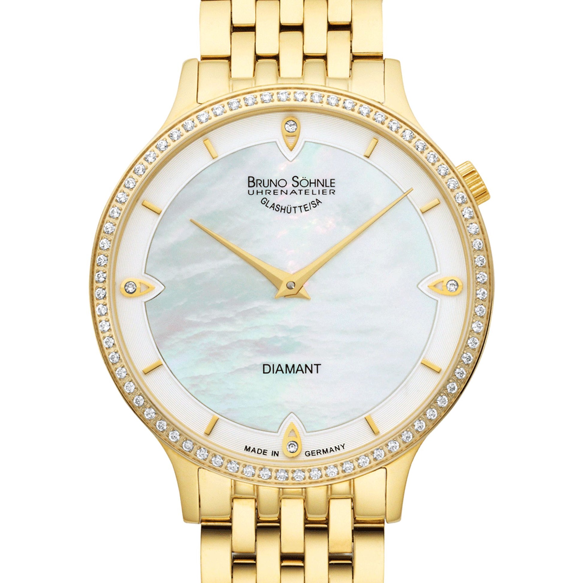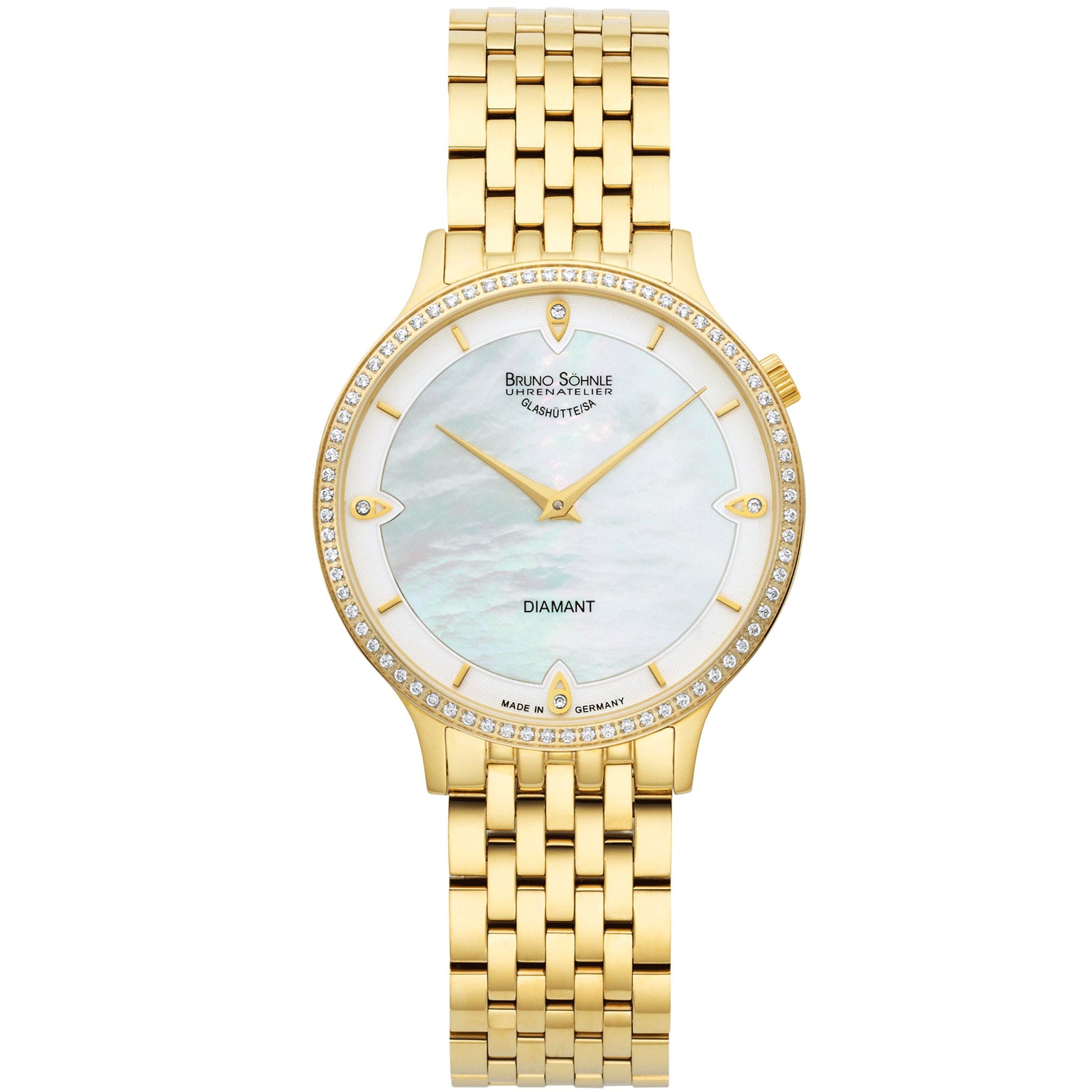 Die Bruno Glashütte/Sa. Bologna III 17-33213-294 ist eine flache, stilvolle Damenuhr in elegantem Goldton. Die mit Diamanten besetzte Lünette verleiht ihr eine dezente, edle Ausstrahlung, die klassische Eleganz mit modernem Design vereint. Dieses Modell eignet sich ideal für Frauen, die eine kombinierte Wirkung aus Luxus und zeitloser Anmutung suchen.