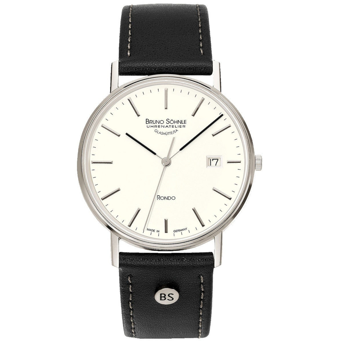 Die Rondo 17-13105-241 von Bruno Söhnle Glashütte/SA. besticht durch ihr klassisch flaches Design mit 38 mm Durchmesser. Das weiße Zifferblatt mit Strichindizen sorgt für exzellente Ablesbarkeit und eine elegante Optik. Dieses Modell verbindet komfortables Tragegefühl mit zeitloser Eleganz – ideal für Liebhaber präziser Uhrmacherkunst im puristischen Stil.