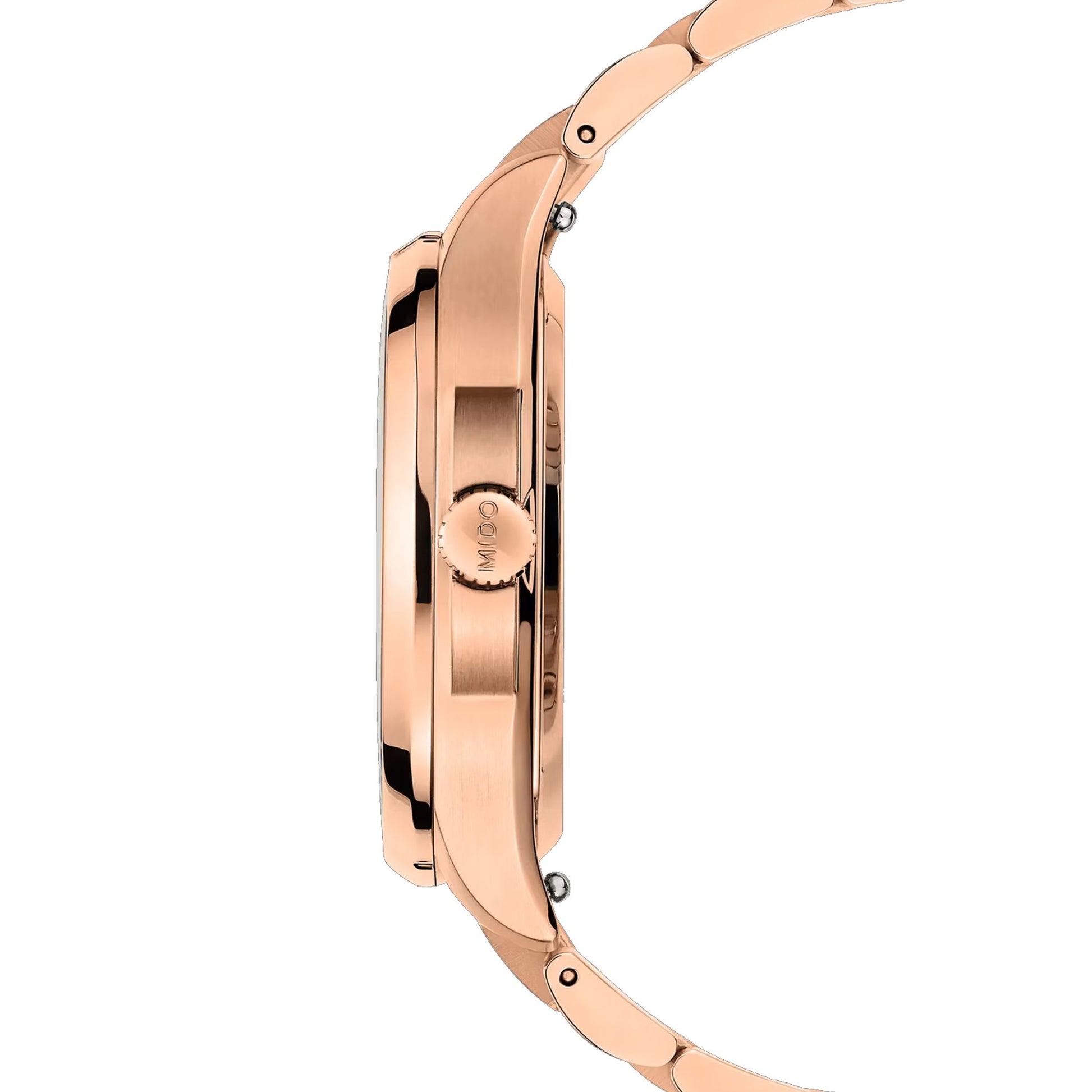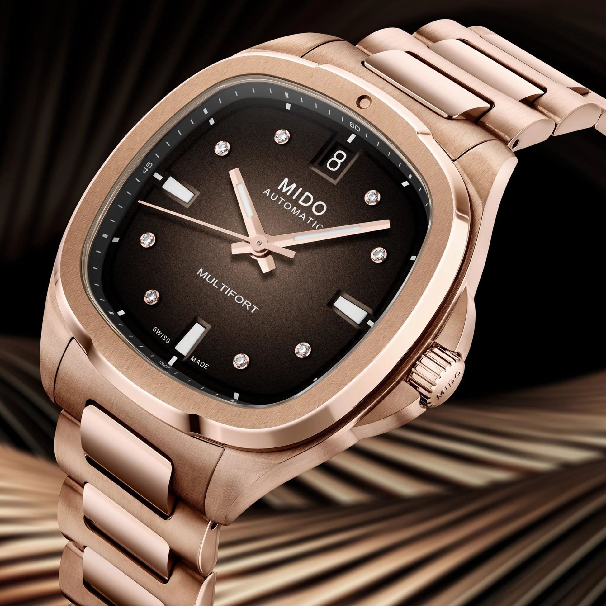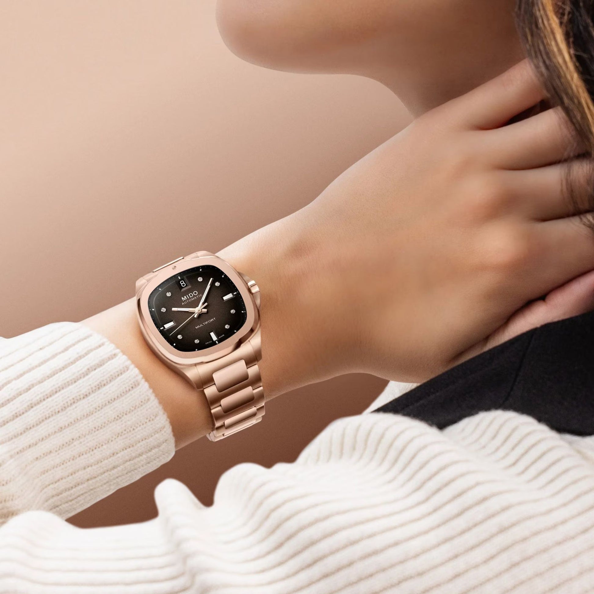 Die MIDO Multifort TV 35 M049.307.33.296.00 ist eine Damenuhr, die Luxus mit alltäglicher Tragbarkeit verbindet. Das elegante Roségold-Gehäuse wird durch funkelnde Diamanten veredelt und verleiht der Uhr eine feminine, raffinierte Ausstrahlung. Das charakteristische Kissengehäuse der Multifort-Serie wird hier in einer 35-mm-Größe präsentiert – perfekt proportioniert für das Damengelenk. Mit ihrer zeitlosen Ästhetik und hochwertigen Verarbeitung ist diese Uhr der ideale Begleiter für jeden Tag, der Eleganz und Zuverlässigkeit gleichermaßen fordert.